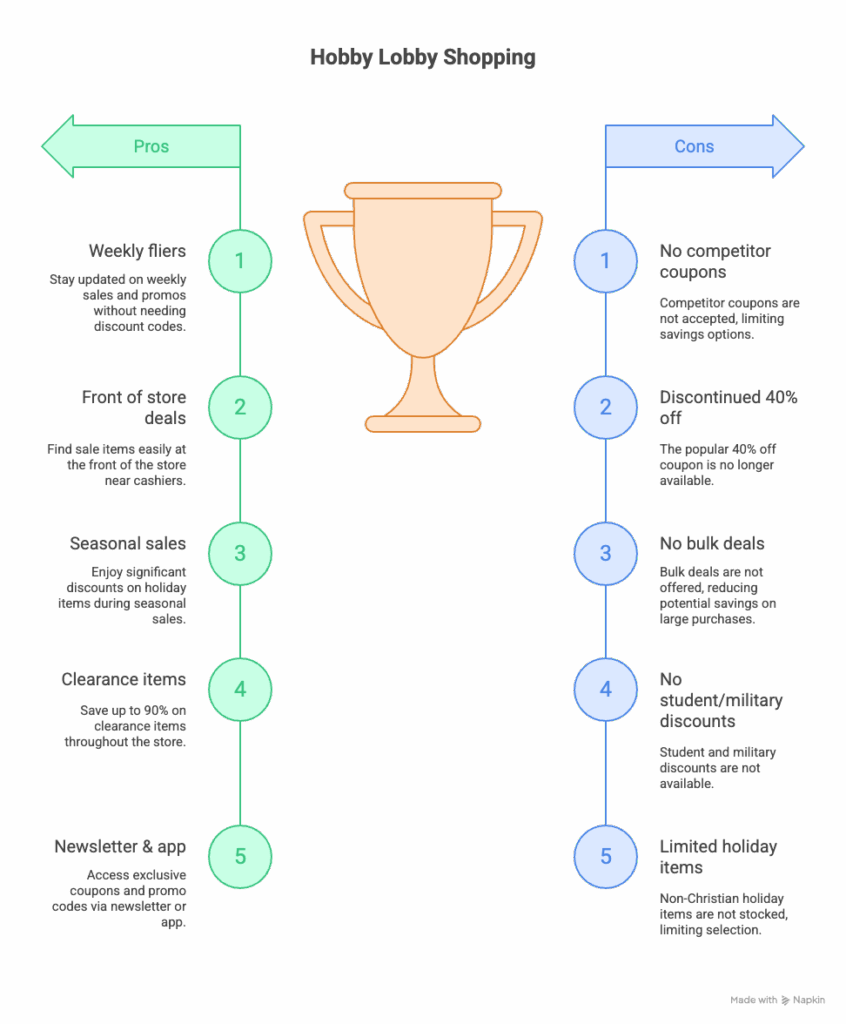 Hobby Lobby offers various sales and discounts throughout the year. Customers can expect big sales around Easter, Christmas, Halloween, and Valentine’s Day, with significant clearance sales after holidays. Regular items like furniture, custom framing, books, wearable art, and home décor fabric departments are always available at a discount of 30% off. Additionally, items like home décor, floral arrangements, and art supplies are offered at 50% off every other week.